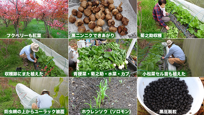 フクベリーの葉も色づき紅葉した。黒ニンニクが出来上がった。大葉春菊(菊之助)をいっぱい収穫した。シャオパオ、水菜、カブも収穫した。その跡にまた菊之助を植えた。小松菜のセル苗も植えた。寒くなるので防虫網トンネルの上からユーラックも被せた。ハウスのホウレンソウ(ソロモン)が発芽した。黒豆を抜き取り脱粒した。