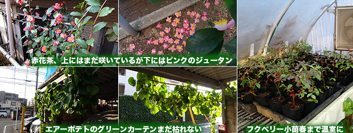 玄関脇の赤花茶、上の方はまだいっぱい咲いているが、地面にはもうピンクのジュータン。エアーポテトのグリーンカーテンはまだ枯れない。フクベリーの小苗を温室に取り込んだ。春までに少しでも成長させる。 (T)
