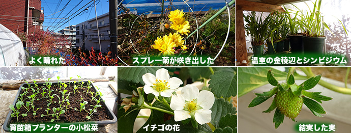 冬型になりスカッと晴れた。スプレー菊が咲き出した。温室内には金稜辺とシンビジウムが冬籠り。育苗床い箱プランターの小松菜が育っている。イチゴの花が咲き、実もなり始めた。 (T)