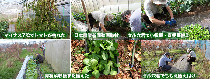 雨除けハウス内がマイナス7℃になりトマトが枯れた。冬になった。日本農業新聞の動画取材だった。大根畝を透明のラッカセイマルチを張ってみた。中央にセル穴君で12cm間隔の穴を開け、シャオパオときよすみのセル苗を植えた。大根の種まきは後日する。菜っぱ畝の青梗菜を収穫し、収穫跡にまた青梗菜のセル苗を植えた。タマネギ(ももえ)の残りをセル穴君で植えた。 (T)