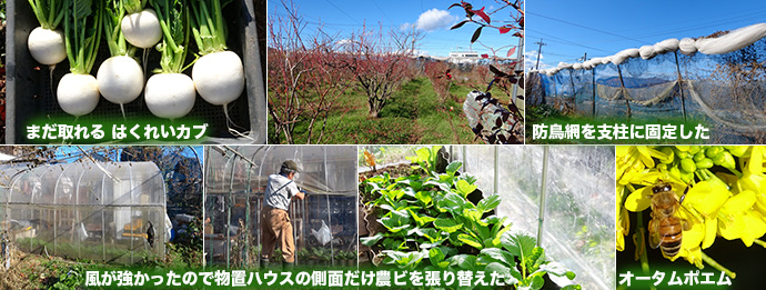 種まきをずらしたのではくれいカブがまだ取れる。北側に寄せただけだった防鳥網を支柱に縛って固定した。物置ハウスの農ビを張り替えるのだが、風が強かったので、今日は側面だけにした。オータムポエムにミツバチがやってくる。