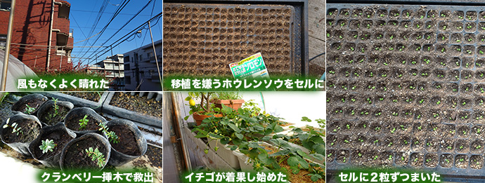 今日は風もなくよく晴れた。移植を嫌うホウレンソウだが、セル苗ならいけると思い、2粒ずつまいてみた。厳寒期に外でまくより早くできるはず。猛暑で枯れたクランベリーを挿木で救出している。人工授粉でもイチゴが着果し始めている。