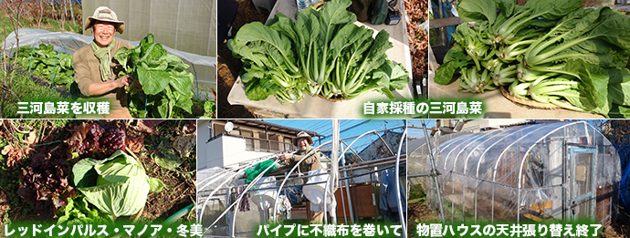 10月6日にまいた江戸東京野菜の三河島菜を収穫した。大きな菜っぱだが、軟らかく生で食べても美味しい。今年は塩漬けもしてみようと思う。レッドインパルス、マノア、冬美も収穫した。風も無かったので物置ハウスの天井を張り替えた。パイプに接するところから破けるので長持ちさせるためパイプに不織布を巻いてから展張した。