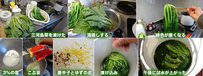 昨日収穫した三河島菜を塩漬けにした。大きな鍋で湯通しすると葉色の緑が一段と濃く鮮やかになった。葉重の3%の塩+こんぶ茶+唐辛子+ゆずの皮を混ぜて重しをした。午後になるといっぱい水が上がっていた。