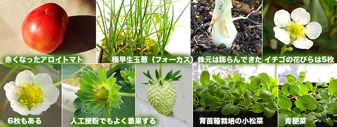 寒さで枯れたトマトになっていた緑色の果実は部屋の中で赤くなった。温室の極早生玉葱(フォーカス)株元はもう膨らんできた。イチゴの花の花びらは5枚だが6枚もある。人工授粉でもよく着果する。育苗箱栽培の小松菜(きよすみ)と青梗菜(シャオパオ)が育っている。