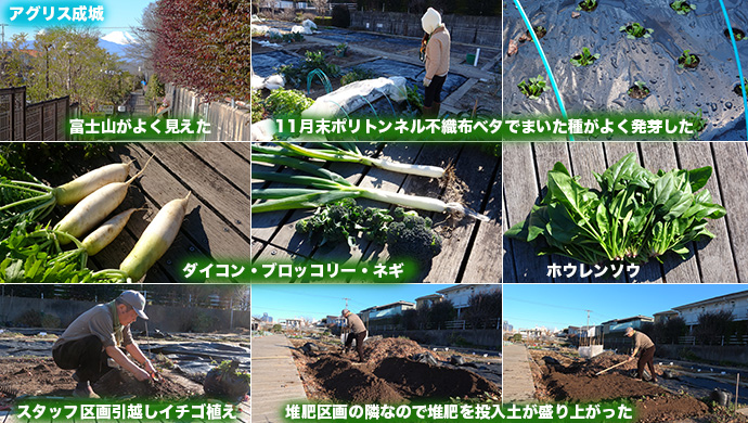 富士山がよく見えた。11月末にホウレンソウ、ルッコラ。カブをまいて不織布ベタがけ、ポリトンネルでよく発芽した。ダイコン、ブロッコリー、ネギが取れている。スタッフ区画のホウレンソウを収穫した。次年度スタッフ区画が引っ越しになり、堆肥区画の隣に決まったので、早速イチゴを引っ越した。隣の堆肥区画から堆肥を大量に投入したら土が盛り上がった。