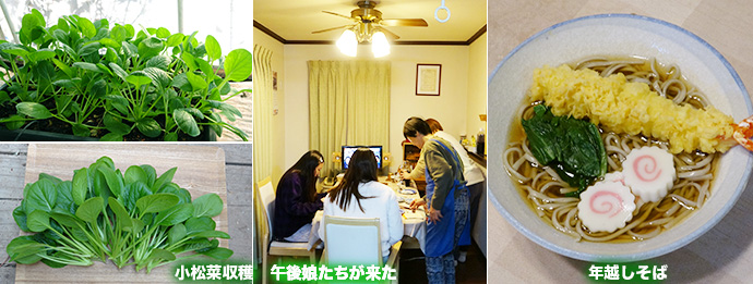 車庫上温室の育苗箱栽培の小松菜(きよすみ)を収穫した。午後に娘たちがやってきた。末の孫娘の瀬那が成人で酒を飲むようになっていた。月日の流れを感じた。年越しそばをみんなで美味しく食べた。