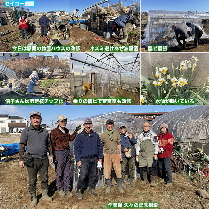 長い間ブルーシートで応急処置のままだった物置ハウスを改修した。ネズミの侵入よけにハウス周りには畦畔版のあぜ波を埋め込んだ。農ビも張り完成。信子さんは黙々と剪定枝のチップ化。余った農ビで育苗ハウスも改修した。スイセンが咲いている。今日は男性が多かった。作業後、久々に記念撮影をした。