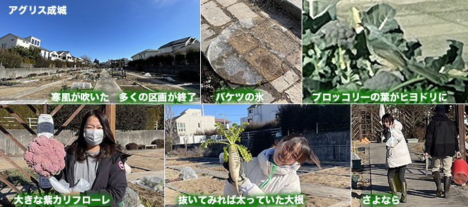 天気は良かったが北風が冷たかった。バケツには氷が張っていた。ほとんどのブロッコリーの葉がヒヨドリに食われ始めた。大きな紫カリフローレが取れた。地上部は細くても抜いてみれば思いのほか大根は太っていた。次期お休みの矢﨑さんとは一旦今日でさよなら。