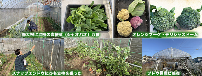 ハウスの春大根に混植の青梗菜(シャオパオ)を収穫した。オレンジブーケ、紫カリフローレ、デリシャスドームも収穫した。ニムラサラダスナップにひも支柱を張った。また破けたブドウ棚農ビを修復した。