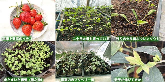 車庫上温室のイチゴを収穫した。完熟で美味しい。育苗箱で二十日大根(ポピールージュ)が育っている。残りのセル育苗ホウレンソウも育っている。大葉春菊(菊之助)をまたまいた。よく発芽した。温室に入れているフクベリー苗は新芽が出始めた。