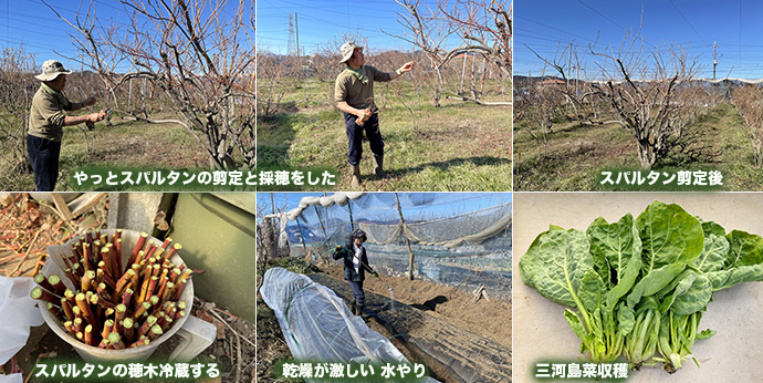 2月はアグリス成城勤務がお休みなので日曜日だがフクベリー苗の受け渡しがあり農園へ行った。やっと残りのブルーベリーの剪定に取り掛かった。シンボルツリーのスパルタンから。穂木も取った。冷蔵する。乾燥が激しいので水やりをした。三河島菜を収穫した。