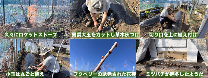 久々に太い剪定枝をロケットストーブで燃やした。先日キタアカリは植えたが、今日は男爵をやや細畝に1条植えした。約3m畝3本。フクベリーの9月の切り詰め剪定で花芽が誘発されている。ミツバチが越冬したようだ。
