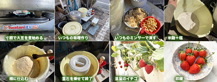 毎年恒例の味噌を仕込んだ。寸胴で大豆を煮て、ミンサーで潰して塩麹と混ぜる。漬物樽で夏には出来上がる。温室のイチゴが次々と熟す。今年はナミハナアブ採集のチャンスを逸したが、人工授粉でも良い形のイチゴがなった。 (T)