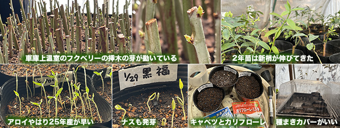 車庫上温室のフクベリーの挿木の芽が動き出した。2年苗は新梢が伸びてきた。アロイトマト過去の種を全部まいたが、やはり25年産が早く発芽した。ナスも出始めている。キャベツ(新藍)カリフローレ・ミスタの種をまいた。育苗箱にピタッとあう種まきカバーがいい感じ。 (T)
