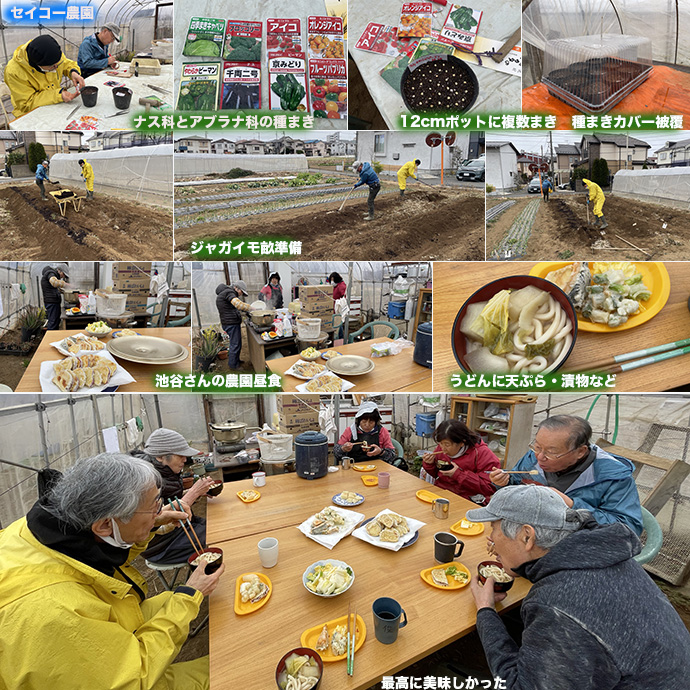 どんより曇りで寒かった。育苗ハウス内でナス科とアブラナ科の種まきを12cmポットに複数まいた。育苗箱にピッタリ合う種まきカバーをかけ、農電マットの上に置いた。ジャガイモを植える予定だったが、畝立てまでやった。ジャガイモは来週植える。外は寒かったが、池谷さんが農園産のサツマイモ、カボチャ、トウガン、ハクサイ、ネギで天ぷらなどと煮込みうどんでハウス内で美味しい農園昼食を味わった。 (T)