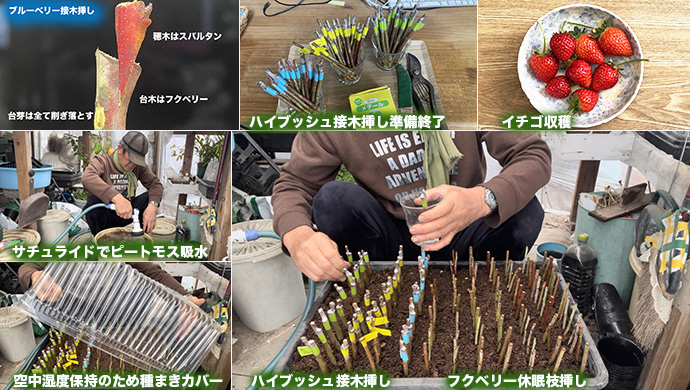 久々の雨だったが、雨量はそれほどでもなく、ちょっとのお湿りにはなった。午前中、フクベリーを台木にハイブッシュの接木挿し準備をした。午後温室で挿木をした。ピートモスはサチュライドを混ぜるとよく吸水する。フクベリーの休眠し挿しとハイブッシュの接木挿しをした。空中湿度を保つため、種まきカバーをかけた。