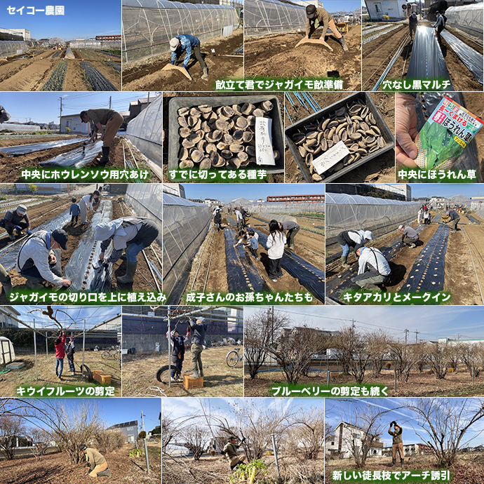 先週雪予報だったので延期していたジャガイモの早植えの畝準備をして穴なし黒マルチを張った。すでに種芋はカットしてありかなり萎んでいた、キタアカリとメークインを2条、切り込みを入れて植えた。成子さんのお孫ちゃんたちもきて賑やかだった。中央にはバーナーで穴をあけ、ホウレンソウ(アンコール)をまいた。ジャガイモの芽が出るころにはホウレンソウが収穫になる。植え付け後ポリトンネルをかけた。キウイフルーツの剪定もした。ブルーベリーの剪定の続きもした。古い枝を切り、新しい徒長枝を寝かせ誘引してワイヤーで結びアーチ化した。寝かせた枝には今年来年用のなり枝がたくさん伸びる。 (T)