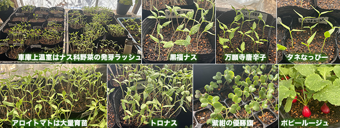 車庫上温室の育苗床ではナス科野菜の発芽ラッシュ。ナス、ピーマン、トウガラシ、トマト。アロイトマト、トロナスは大量にまいている。小松菜(紫紺の優勝旗)はセル苗育苗中。二十日大根(ポピールージュ)は育苗箱栽培でよく育っている。 (T)