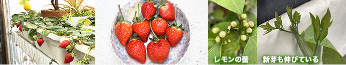 温室のイチゴがまた色づき収穫した。レモンは蕾だけでなく新芽もいっぱい伸びている。 (T)