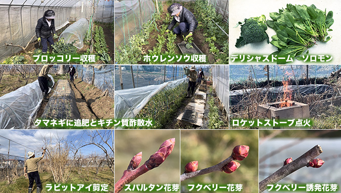ブロッコリー(デリシャスドーム)ホウレンソウ(ソロモン)を収穫した。タマネギに追肥とキチン質酢を散水した。ロケットストーブで太い剪定枝などを燃やした。ラビットアイの剪定を続けた。ブルーベリーの花芽も膨らんでいる。