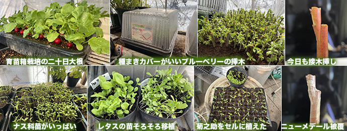 正月の小松菜収穫後の育苗箱栽培のハツカダイコン(ポピールージュ)が葉陰からちらほら赤く見えるようになった。なんとも可愛らしくきれいだ。ブルーベリーの挿木に被せている種まきカバーが空中湿度を保つにはとてもいい。今日も接木挿しを少しした。ナス科の苗がいっぱい移植を待っている。レタスの苗も移植を待っている。大葉春菊(菊之助)の芽出し苗を1本ずつセルトレーに移植した。接木に使うニューメデールはとても扱いやすくていい。 (T)