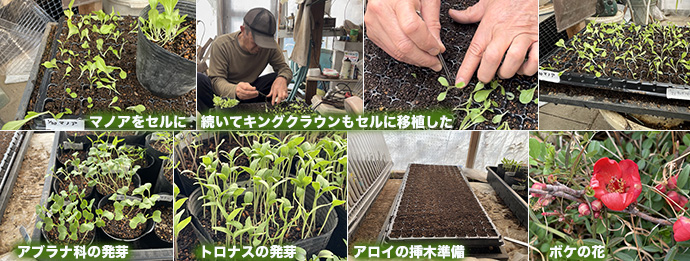 レタス(マノア、キングクラウン)の芽出し苗をセルトレーに移植した。アブラナ科の発芽も揃い、本葉が見えてきた。トロナスもよく発芽した。アロイトマトの胚軸さしきを大量にするため、セルトレーに培土を入れて準備した。車庫上でボケの花が咲いている。 (T)