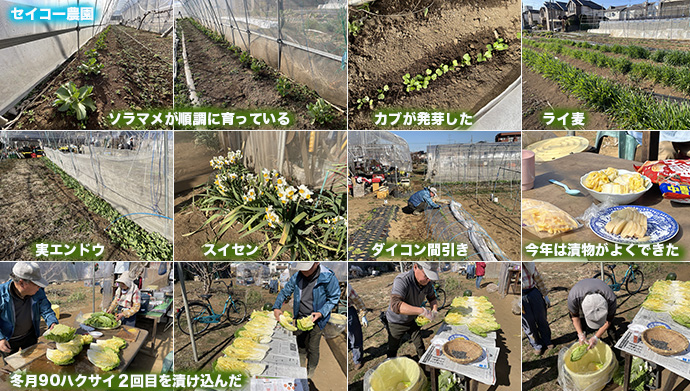 ソラマメが順調に育っている。カブがやっと発芽した。ライブ技も生育旺盛。実エンドウも順調。スイセンがずっと咲いている。春大根(天宝)の間引きをした。休憩時の漬物が美味しい。今年の漬物は上出来。今日は冬月90ハクサイ2回目の漬け込みをした。 (T)