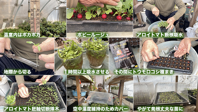 今日は南風が吹き込み温室内もポカポカ。二十日大根がが太ってきた。アロイトマトの胚軸切断挿木をした。植物矯正細菌が入り丈夫な苗になるやり方だ。地際で根を切り1時間吸水させる。天恵緑汁を少し入れた。トウモロコシ(バイカラー80)の種をセルトレーにまいた。アロイトマトはいつもより多く作るので場所を取らないセルトレーに挿木した。空中湿度を保ため種まきカバーを被せた。丈夫な苗になるだろう。
