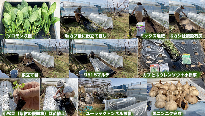 ホウレンソウ(ソロモン)が取れている。秋カブ後に畝立て直し。堆肥、ボカシ、牡蠣殻石灰を入れて9515マルチを張り、カブ(あやめ雪、はくれい)とホウレンソウ(ソロモン)は種まき。小松菜(紫紺の優勝旗)はセル苗で雲rの中央に植えた。ユーラックトンネルをかけた。黒ニンニクが出来上がった。