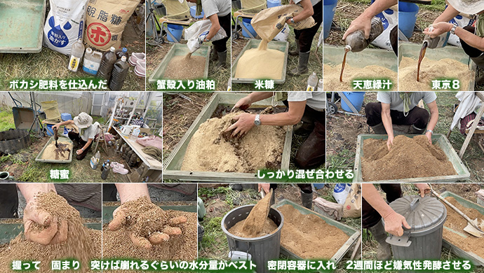 雨予報だったが農園へ行った。ボカシ肥料を仕込んだ。最近は水は使わず、糖蜜を入れている。発酵の素は天恵緑汁と東京8。この時期は約2週間で発酵し、表面に白い酵母のカビが出るのが出来上がりの印。その後乾燥させれば長期保存ができる。