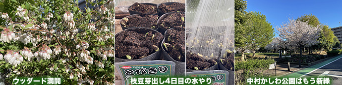 いつの間にか車庫上のウッダードが満開。4日前にまいた芽出しの枝豆(とびきり)土が持ち上がってきた。ここで水をたっぷりやるのがポイント。このあとは初生葉が開くまで毎日水やりをする。午後からは強風だがスカッと晴れた。中村かしわ公園はもう新緑の季節。 (T)