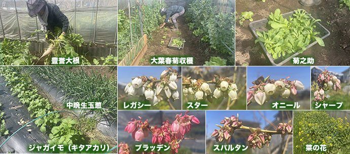 ハウスの春大根(豊誉)が取れている。大葉春菊(菊之助)を収穫した。早植えのジャガイモ(キタアカリ)中晩生玉葱(アトン、ももえ)も順調に生育している。ブルーベリーの花が次々と開花している。スパルタンは遅い。菜の花もミツバチの蜜源として残して咲かせている。 (T)