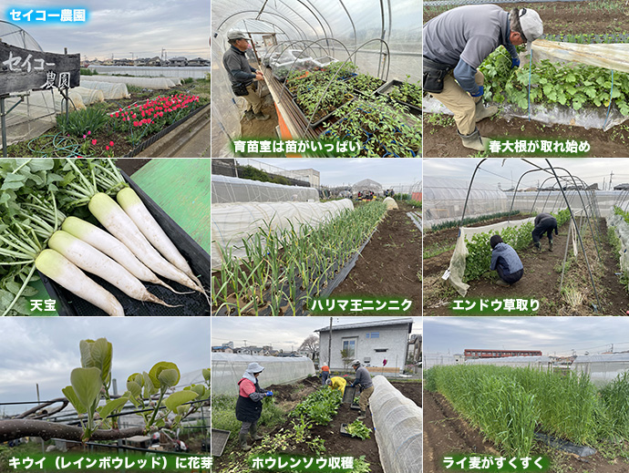 昼までは雨が降らなかった。育苗ハウスには苗がいっぱい。春大根(天宝)が取れ始めた。ニンニクも順調に生育している。エンドウ種辺などの草取りをした。昨年接木したキウイのレインボウレッドに蕾がいっぱいついている。ホウレンソウをいっぱい収穫した。ライ麦が背高く伸びている。敷き藁用は穂が出る前に刈り取る。昼前に農園で年に1度の総会をした。その後レストランで会食があった。 (T)