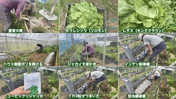 豊誉、キングクラウン、ソロモン、ワケギ、ニムラサラダスナップ、のらぼう菜を収穫した。ハウスの側面のポリを下げて換気した。ジャガイモの芽かきをした。ニュービックリジャンボを細畝マルチで種まきした。以前、草と一緒に抜いてしまったのでマルチで草よけ。