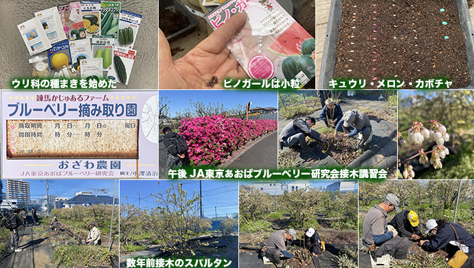 最近はウリ科の種まきは3月から4月に遅らせている。今日から少しずつ種まきを始めた。今年初めてのスイカ(ピノガール)の売りは種が小さいこと。午後、JA東京あおばブルーベリー研究会の接木講習会がいつものおざわ農園であった。数年前の接木スパルタンがりっぱになっていた。 (T)